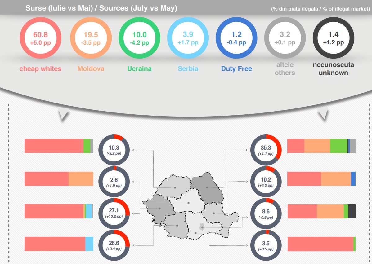 „Nord-Est continuă să fie regiunea cea mai afectată de piața neagră, cu un nivel al comerțului ilicit de 35,3%. Din punct de vedere al provenienței, produsele „cheap whites” ((mărci ieftine, care nu aparţin marilor producători şi care sunt destinate pieţei negre) înregistrează o creștere de 5 p.p. comparativ cu luna mai, atingând o pondere record de 60,8%. Ponderea produselor provenite din Ucraina (10%) și Moldova (19,5%) se află în scădere, iar Serbia crește până la 3,9%, față de 2,2% în mai”, a declarat Marian Marcu, Directorul Companiei de Cercetare Novel Research.