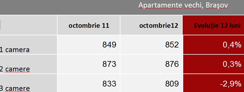 În Braşov, valoarea medie cerută de proprietari în luna octombrie a fost de 841 euro/mp, cu 1,2 mai mică faţă de cea de acum 12 luni. Indicele imobiliare.ro arată că pretenţiile proprietarilor de apartamente au crescut şi cer preţuri mai mari. Astfel, pe segmentul garsonierelor s-a înregistrat o creştere anuală de 0,4%, iar în cazul apartamentelor cu două camere de 0,3%. Doar apartamentele cu trei camere s-au ieftinit în perioada octombrie 2011-octombrie 2012 cu 2,9%, ajungând la o valoare medie de 809 euro/mp.