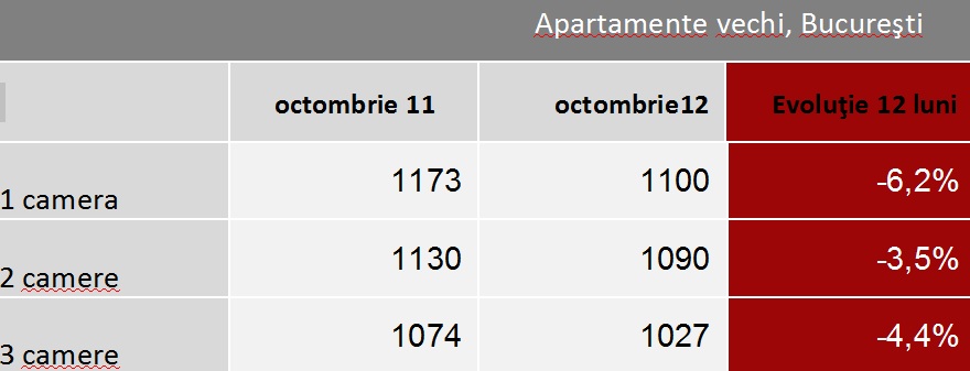 Valoarea medie e preţului cerut de proprietari pentru locuinţele vechi din Bucureşti a fost în luna octombrie de 1.054 euro/mp suprafaţă utilă, cu 4,3% mai puţin faţă de luna octombrie a anului trecut, arată indicele realizat de portalul imobiliare.ro. Cel mai mult s-au ieftinit garsonierele, al căror preţ mediu cerut a scăzut într-un an cu 6,2% şi s-a ajuns la o valoare medie de 1.100 euro/mp. În cazul apartamentelor cu trei camere, scăderea anuală înregistrată a fost de 4,4%, în timp ce preţurile la apartamentele cu două camere au coborât cu 3,5%.