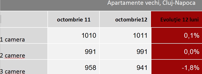 Apartamentele vechi din Cluj-Napoca au ajuns luna trecută la un preţ mediu cerut de 974 euro/m, în scădere faţă de acum un an cu doar 0,3%. Aici, preţul mediu pentru o garsonieră a crescut într-un an cu 0,1%, în timp ce în cazul apartamentelor cu două camere se observă o stagnare. Apartamentele cu trei camere s-au ieftinit cu 1,8% în ultimul an şi sunt cele mai ieftine, calculat la preţul pe metru pătrat, de 941 euro.