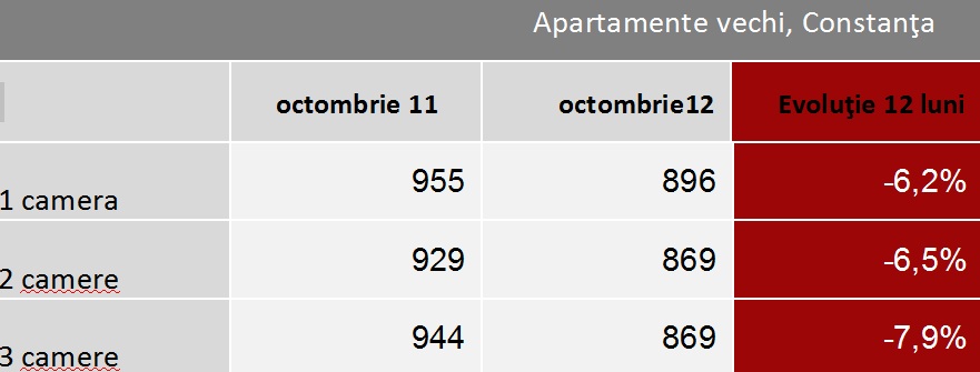 Cele mai mari scăderi de preţuri la apartamentele vechi în perioada octombrie 2011- octombrie 2012 s-au înregistrat la Constanţa. Aici, preţurile cerute pentru apartamentele cu trei camere au scăzut cu 7,9%, ajungând la o valoare medie de 869 euro/mp. La acelaşi preţ mediu au ajuns şi locuinţele cu două camere, însă scăderea anuală a fost mai mică, de 6,5%. Garsonierele sunt mai ieftine cu 6,2%.