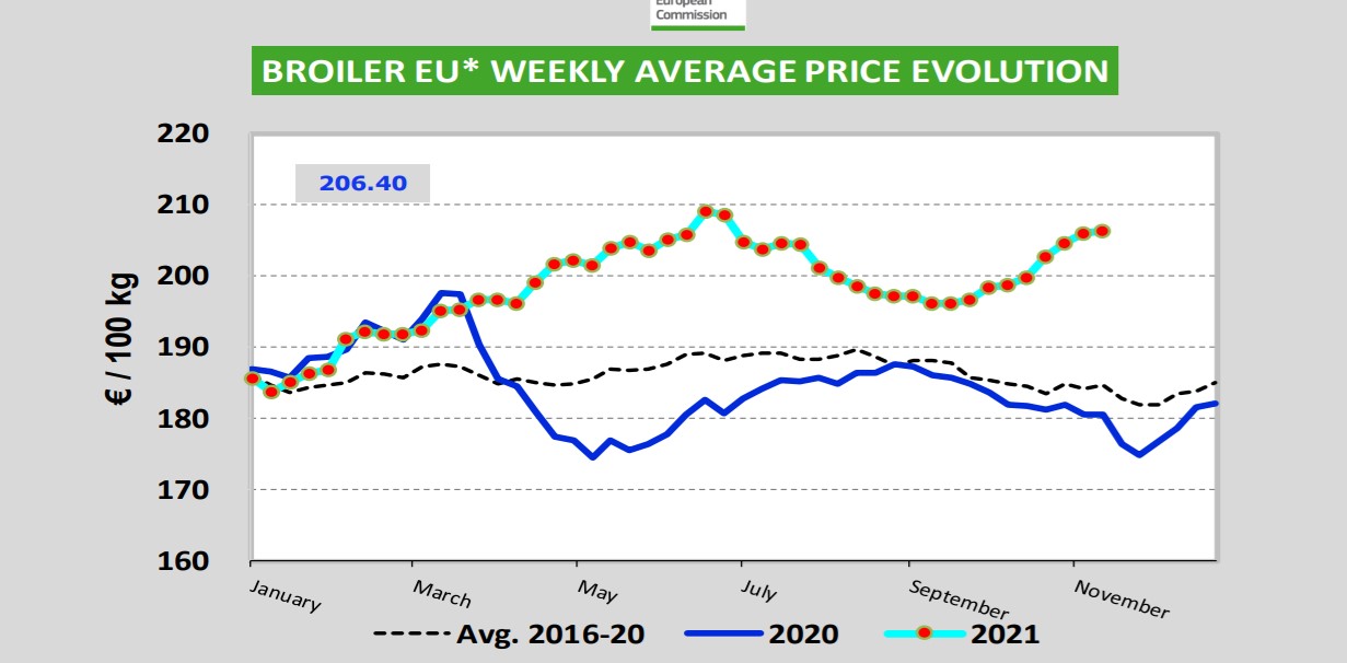 Potrivit celor mai recente date ale Comisie Europene, prețul cărnii de pui la poarta fermei a ajuns în săptămâna ce a început cu 15 noiembrie la 157 de euro carcasa de 100 de kilograme, cel mai mare preț din luna septembrie încoace. În octombrie, prețul mediu a fost de 155,95 de euro 100 de kilograme (771,6 lei), cu 25,1% mai mare față de perioada similară a anului trecut dacă ne raportăm la euro sau cu 27% în plus dacă se face calculul în lei. Este a doua cea mai mare creștere de preț din UE, după Polonia unde carcasa s-a scumpit cu 28,3% până la 125 de euro suta de kilograme.