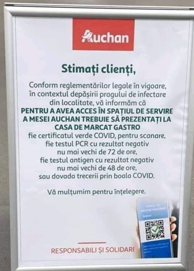 „Pentru a avea acces în spațiul de servire a mesei Auchan trebuie să prezentați la casa de marcat Gastro fie certificatul verde COVID, pentru scanare, fie testul PCR cu rezultat negativ nu mai vechi de 72 de ore, fie testul antigen cu rezultat negativ nu mai vechi de 48 de ore, sau dovada trecerii prin boala COVID”, este mesajul cu care sunt întâmpinați clienții unor magazine Auchan care doresc să mănânce în magazin.