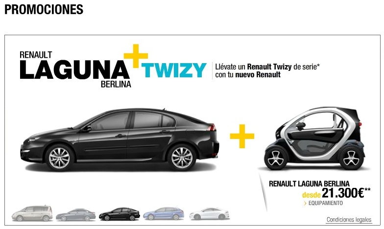 Astfel, cine cumpără un Renault Espace (preţ de plecare 32.000 de euro), un Renault Latitude (preţ de la 24.750 de euro) sau un Renault Laguna, în versiune berlină, grand tour sau coupe (preţ de la 21.300 de euro) va pleca acasă şi cu un automobil electric, Renault Twizy Urban, în varianta de serie. Maşina electrică are un preţ de 6.990 de euro.
