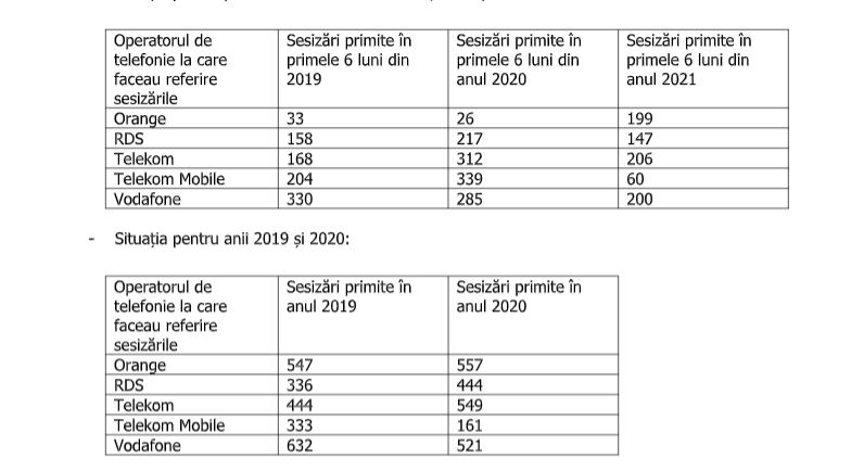 Spre comparaţie, în primele 6 luni din anul 2019, au fost primite 1.468 sesizări, din care 105 făceau referire la calitatea semnalului de voce/date, iar în prima jumătate a anului 2020 au fost primite 2.421 sesizări, din care 210 aveau acest subiect.