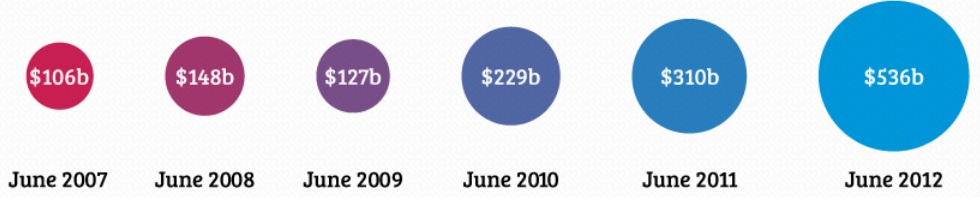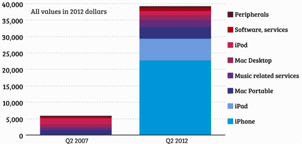 În doar cinci ani, iPhone a schimbat drastic afacerile Apple. Dacă în 2007 vânzările iPhone reprezentau doar o mică cifră din afacerile companiei, în ultimul trimestru, acestea reprezentau 58% din veniturile Apple. În graficul de mai jos sunt reprezentate veniturile în milioane de dolari.