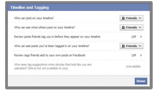 O altă setare importantă pe care nu trebuie să o treci cu vederea este „Timeline and Tagging”. Aici modurile „Cine poate posta pe timeline-ul tău”, ” Cine poate vedea ce postează ceilalţi pe timeline-ul tău” şi „Cine poate vedea postările în care ai fost etichetat” să fie pe modurile „Friends” sau „Only Me”.