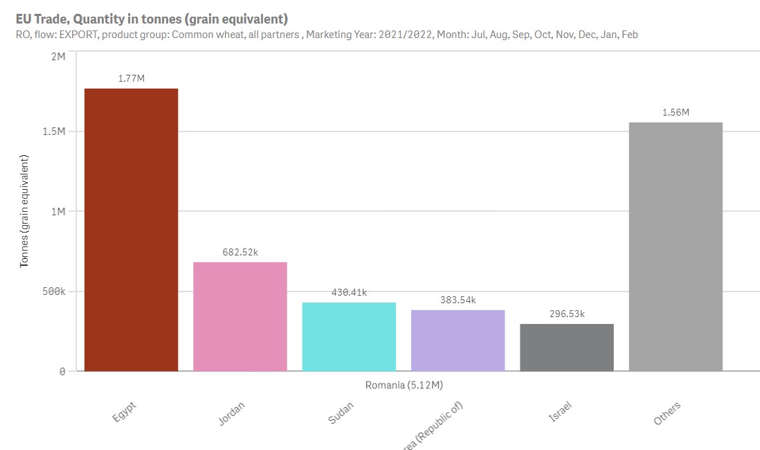 Pentru piața egipteană, către care România livrrează cele mai mari cantități de grâu, concurăm cu Franța, care participă cu prețuri competitive la licitațiile GASC (Autoritatea generală pentru aprovizionarea cu produse de bază egipteană). În periada iunie 2021 – februarie 2022, înainte de izbucnirea conflictului, exporturile europene de grâu către Egipt au provenit în proporție de 43% din România, 29% din Rusia, 23% din Ucraina și restul de 5% din Franța. Grâul românesc a fost oferit la prețuri mai competitive în cadrul licitațiilor guvernamentale decât cel de origine rusă și ucraineană, ceea ce a însemnat că traderii au reușit să livreze în total, până în februarie, 630.000 de tone de grâu, adică aproximativ 50% din exporturile totale de grâu ale României, până la acea dată.