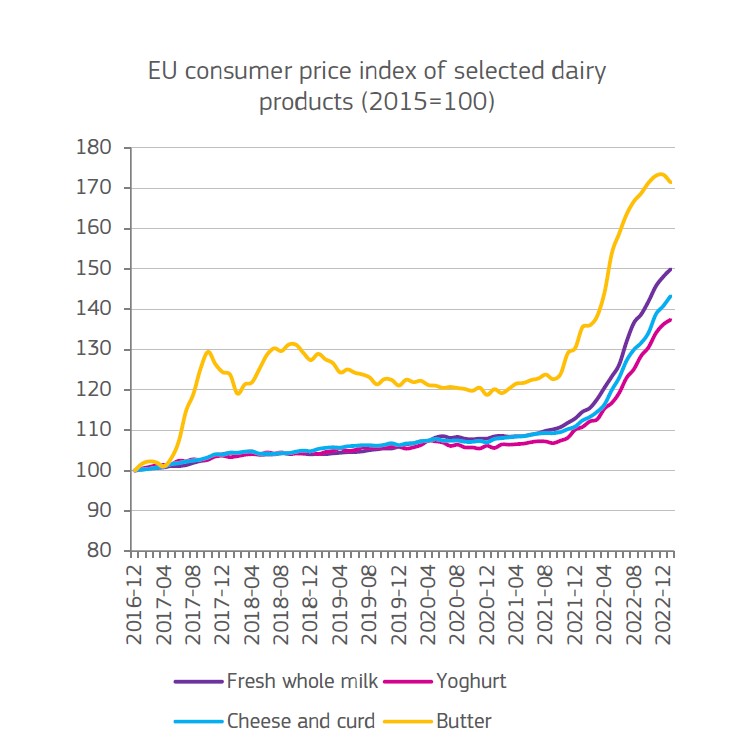 Prețul laptelui crud a scăzut în ianuarie 2023, după 24 de luni de creștere neîntreruptă, ajungând la 55 euro/100 kg în februarie. La unt, între septembrie și martie, prețurile au scăzut cu 32%, urmate îndeaproape de cele ale laptelui praf (SMP -30%, WMP -29%, pulberi din zer -24%). Doar cașcavalul s-a ieftinit cu doar 3%, astfel că , raportat la media pe 5 ani din aceeași săptămână din martie, doar prețurile la zer sunt mai mari.