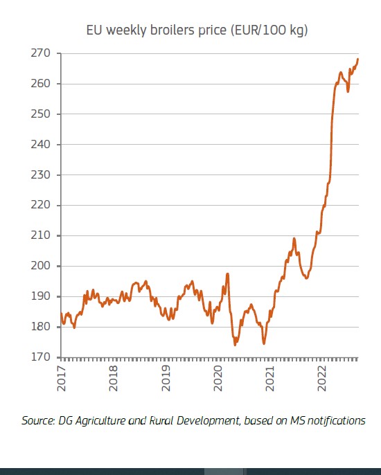 În ceea ce privește carnea de pasăre, aceasta a devenit anul acesta produsul de refugiu al consumatorilor europeni în lupta cu inflația, prețurile rămânând relativ accesibile, comparativ cu alte alimente de bază.