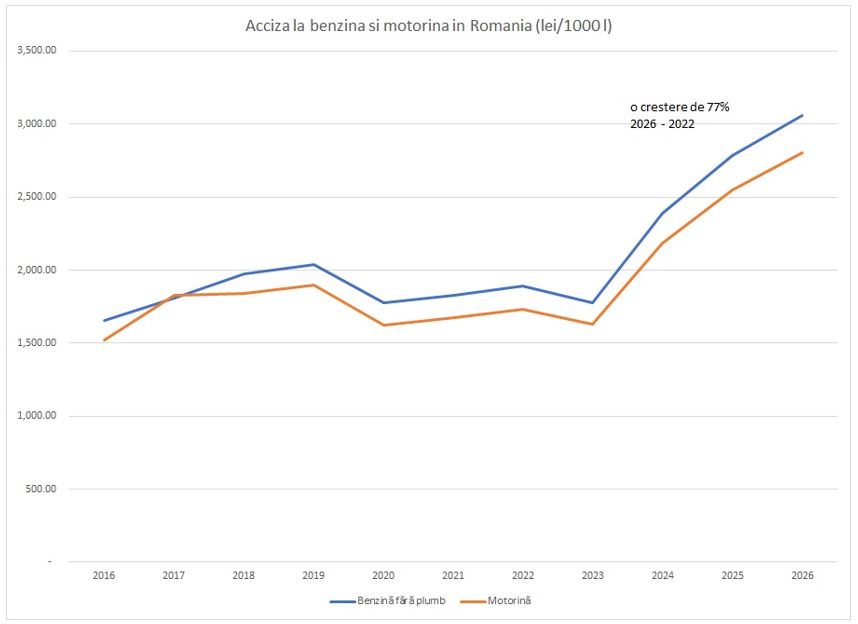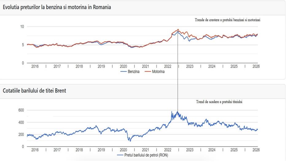 În perioada 2020–2026, prețul benzinei și motorinei a devenit mult mai puțin dependent de prețul petrolului și mult mai dependent de fiscalitate (taxe și accize)