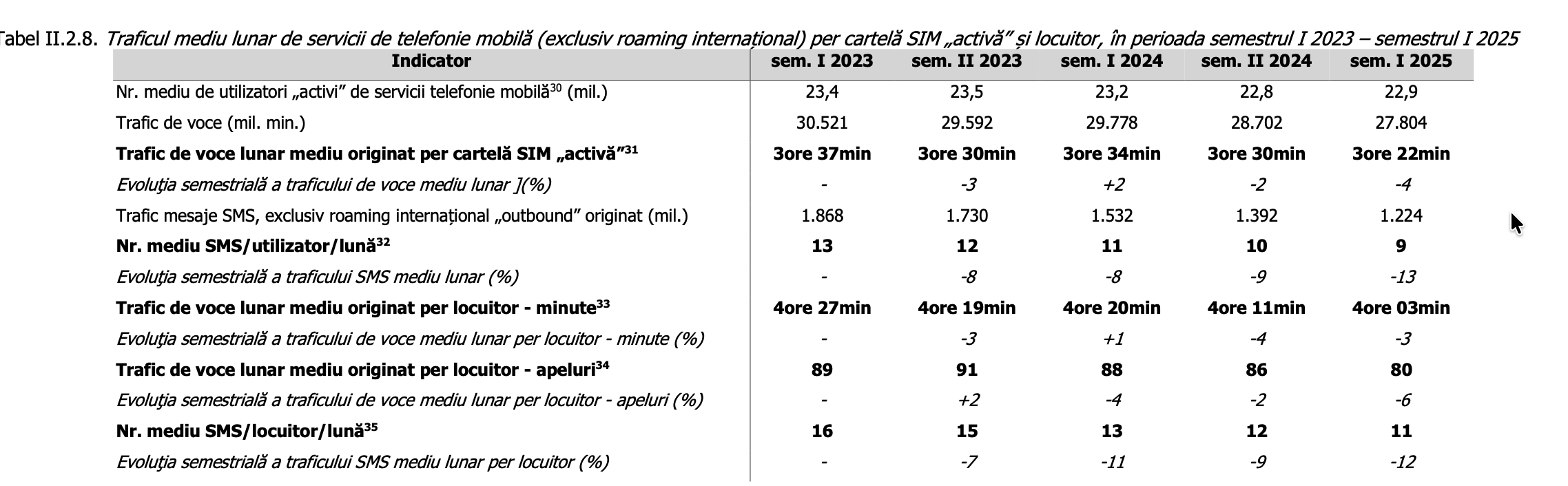 Tot în aceeași perioadă, și traficul total de voce exprimat în minute de pe mobil pe utilizator a scăzut. Dacă în primul semestru din 2023 un utilizator vorbea în medie 4 ore și 27 de minute, în primul semestru din 2025 acesta a ajuns la doar 4 ore și 3 minute, o reducere cumulată de aproximativ 24 de minute într-un an și jumătate.