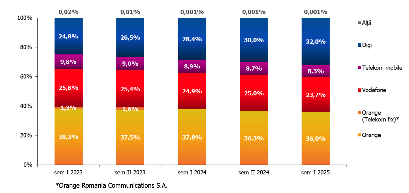 Datele ANCOM arată o piață a telefoniei mobile stabilă din punct de vedere al consumului de voce, dar cu schimbări vizibile în preferințele utilizatorilor. Orange rămâne operatorul cu cea mai mare pondere a traficului de voce, însă pierde încet, dar constant, din cotă: de la 38,3% în primul semestru din 2023 la 36% în primul semestru din 2025. Vodafone păstrează o poziție relativ fixă, oscilând în jurul pragului de 25%, semn că baza sa de clienți tradiționali rămâne loială.