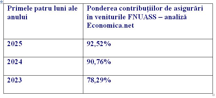 Ponderea veniturilor din contribuţii de asigurări în veniturile totale ale FNUASS în primele patru luni a crescut cu 1.76 puncte procentuale faţă de aceeaşi perioadă a anului 2024, potrivit analizei Economica.net.