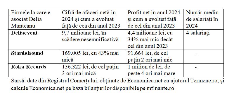 Deliaevent e deţinută de asociaţii Delia Munteanu cu 95% din firmă şi de Nicoleta Spatacean cu o cotă de 5% din capitalul social al firmei, potrivit informaţiilor puse la dispoziţia Economica.net de portalul de specialitate Termene. Firma are activităţi de interpretare artistică (spectacole) şi a lucrat cu un număr mediu de patru salariaţi în anul 2024.