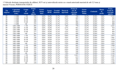 În imaginea de mai jos, puteți vedea toate categorii de vârstă și de cilindree, precum și tarifele de referință aferente.