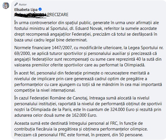 În mai multe răspunsuri date la comenatariile făcute la postarea sa, Elisabeta Lipă precizează că toată suma de 324.000 de euro despre care se face vorbire reprezintă premiile acordate întregului personal din Federația Română de Canotaj, care e compus din 50 de persoane.