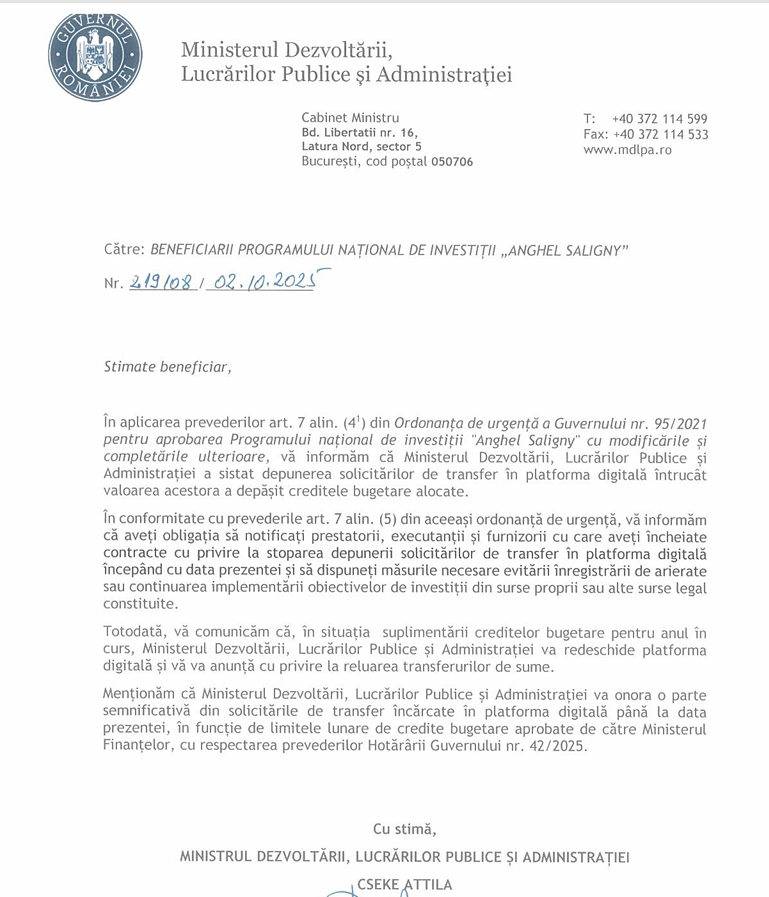 Notificarea trimisă beneficiarilor proiectelor derulate prin programul Anghel Saligny este datată în 2 octombrie.