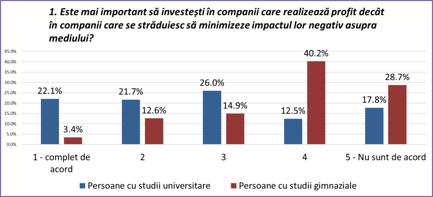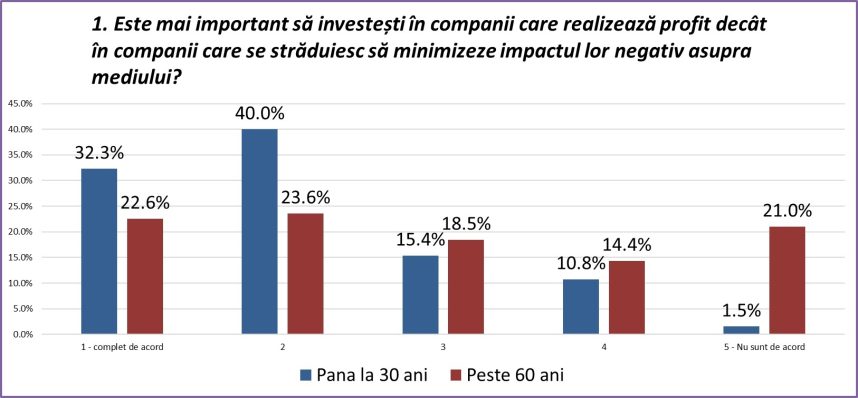 La nivel general, românii sunt împărțiți aproximativ egal între profit și responsabilitățile de mediu ale companiilor. Pe o scară de la 1 la 5 în care 1 înseamnă „complet de acord” cu afirmația de mai sus și 5 „deloc de acord”, punctajul mediu a fost 2,75.