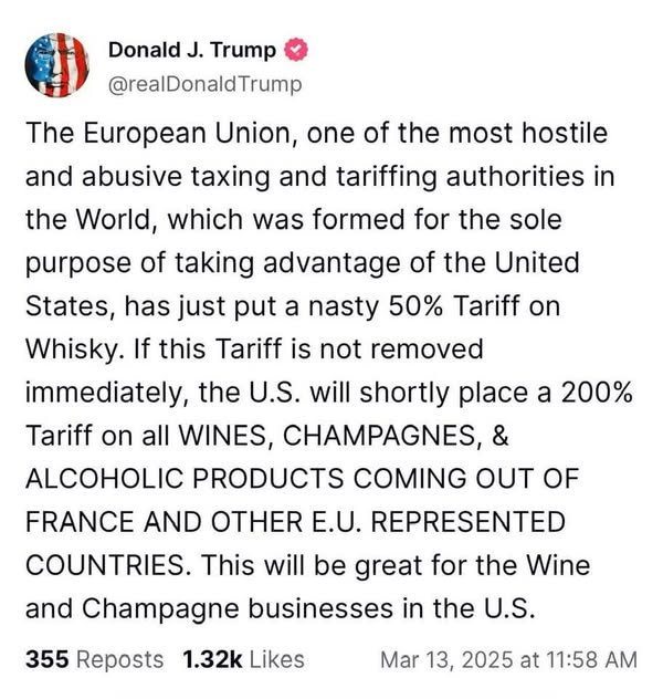 „Uniunea Europeană, una dintre cele mai ostile şi abuzive autorităţi fiscale şi tarifare din lume, care a fost creată doar cu scopul de a profita de pe urma SUA, tocmai a pus o taxă vamală urâtă de 50% pe whisky”, a scris preşedintele american pe reţeaua de socializare Truth Social.