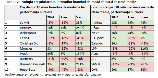 Datele arată că, în ultimii cinci ani, acțiunile de lux au depășit în mod semnificativ performanțele acțiunilor de modă de clasă medie, generând randamente de peste patru ori mai mari (76% față de 16%). De asemenea, coșul mărcilor de lux depășește cu mult performanța principalilor indici globali, generând randamente duble față de Stoxx 600 în ultimii cinci ani și de patru ori față de FTSE 100 (a se vedea tabelul 1).