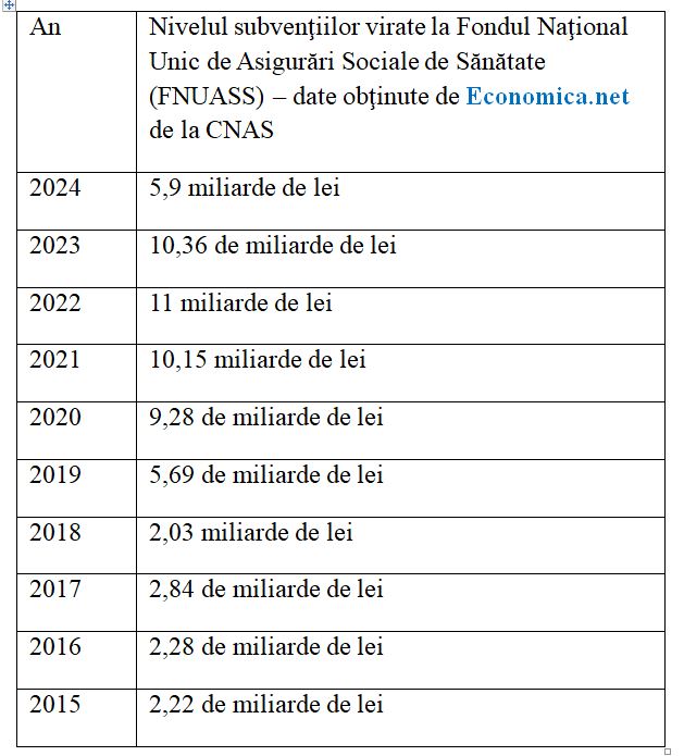 Subvenţiile virate la Fondul Sănătăţii depăşesc 5,9 miliarde de lei în anul 2024 şi sunt cu 42% mai mici decât cele primite în 2023, reiese din calculele pe care le-am făcut pe baza execuţiilor FNUASS.