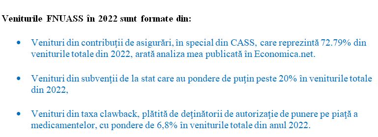 Veniturile din contribuţiile de asigurări de sănătate şi din contribuţii pentru concedii şi indemnizaţii la FNUASS au ajuns la 39,93 de miliarde de lei în anul 2022 şi sunt cu 10,7% mai mari decât cele virate la Fond în anul 2021, reiese din analiza mea publicată în Economica.net. Creşterea sumei virate la Fondul Sănătăţii din contribuţiile de asigurări de sănătate a fost influenţată de majorarea salariului minim brut cu peste 10%, la 2.550 de lei lunar, începând cu 1 ianuarie 2022 (CASS se virează ANAF care o virează mai departe la FNUASS).