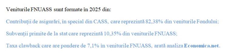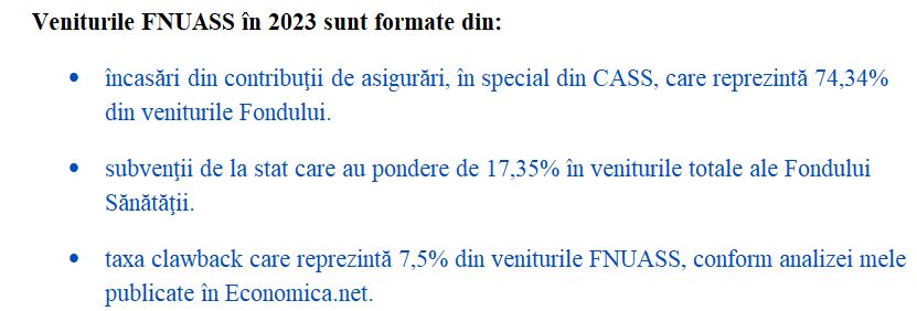 • Fondul Naţional Unic de Asigurări Sociale de Sănătate (FNUASS) este gestionat de CNAS, iar veniturile sale sunt formate din contribuţiile de asigurări de sănătate (CASS) reţinute din salariile angajaţilor, virate la ANAF şi de acolo la Fondul Sănătăţii, din CASS reţinută din pensiile de peste 3.000 de lei lunar, pentru partea de pensie care depăşeşte acest nivel (de 3.000 de lei), dar şi din CASS datorată de unele persoane cu venituri extrasalariale, care o achită plafonat la ANAF, în baza declaraţiei unice depuse la Fisc, din taxa clawback plătită de deţinătorii de autorizaţie de punere pe piaţă a medicamentelor şi din subvenţii. Din banii stânşi la Fondul Sănătăţii, CNAS le plăteşte medicilor, dar şi celorlalţi furnizori de servicii medicale care au încheiat contracte cu Casele Teritoriale de Asigurări de Sănătate, serviciile medicale, medicamentele şi dispozitivele medicale acordate pacienţilor. Din Fondul Sănătăţii sunt viraţi bani către spitale ca să acopere veniturile acordate personalului medico-sanitar şi auxiliar, în baza legii salarizării unice.