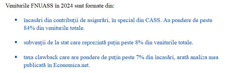 • Creşterea veniturilor la FNUASS din contribuţii de asigurări cu 37% în 2024 faţă de nivelul anului 2023 e efectul direct al majorării salariului minim din octombrie 2023 şi apoi din iulie 2024, eliminării facilităţilor fiscale din construcţii şi sectorul agricol, iar, de la 1 ianuarie 2024, includerii tichetelor de masă şi a unor indemnizaţii de concediu medical în baza de calcul al CASS, urmând ca din 12 aprilie 2024 executivul să restrângă sfera de aplicare a CASS asupra indemnizaţiilor de concediu medical, arată analiza mea publicată în Economica.net.