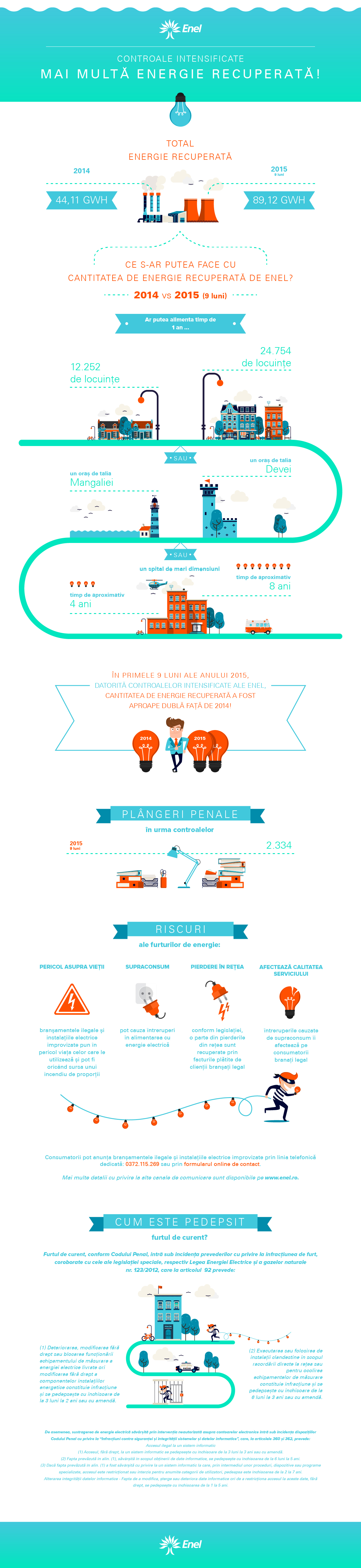 În perioada ianuarie – septembrie 2015, în urma acţiunilor dedicate prevenirii și combaterii furturilor de energie electrică, desfășurate în cele 3 regiuni în care Enel activează (Muntenia Sud, Dobrogea, Banat) s-au constatat peste 2.334 de infracţiuni, prevăzute de Legea nr. 123/2012 privind energia electrică şi gazele naturale, pentru care s-au întocmit plângeri penale.