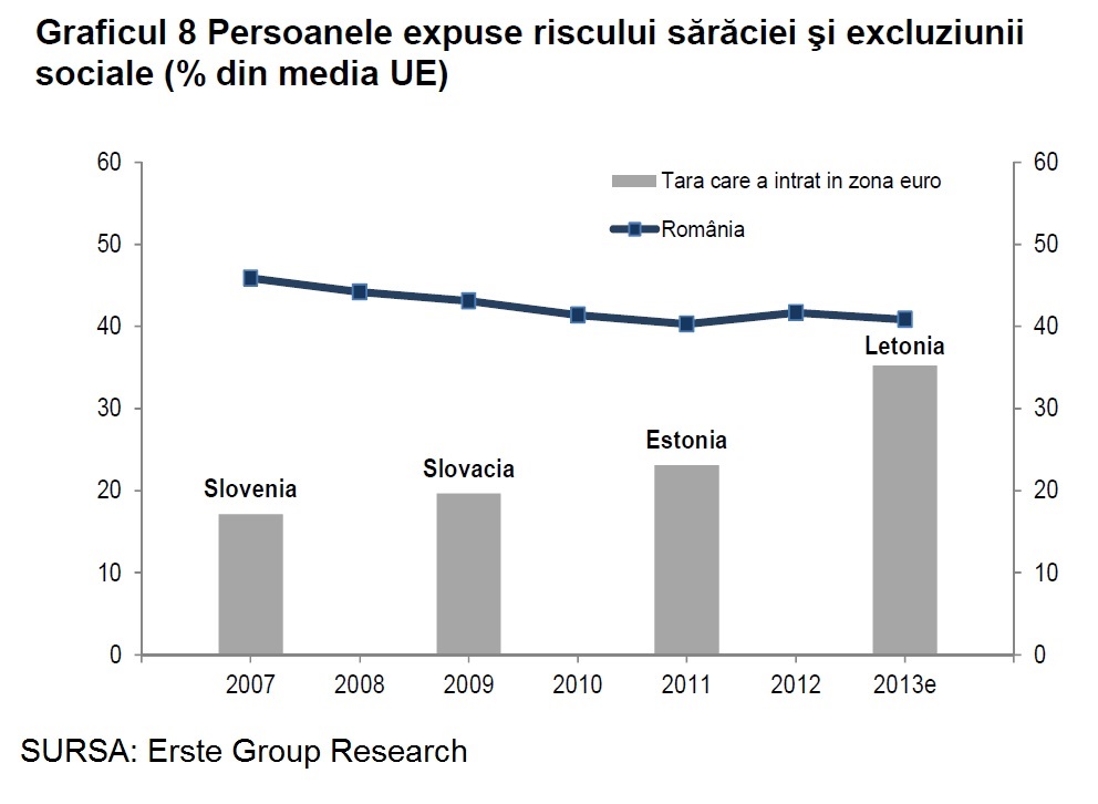 Că „România este încă departe de zona euro în ceea ce priveşte dezvoltarea şi convergenţa reală” o arată „riscul de sărăcie şi de excluziune socială prezentate în tabelul de mai jos. Presupunând că trendul actual de convergenţă va continua, România ar avea nevoie de încă 7-8 ani pentru a ajunge la nivelul înregistrat de Letonia atunci când a aderat”.