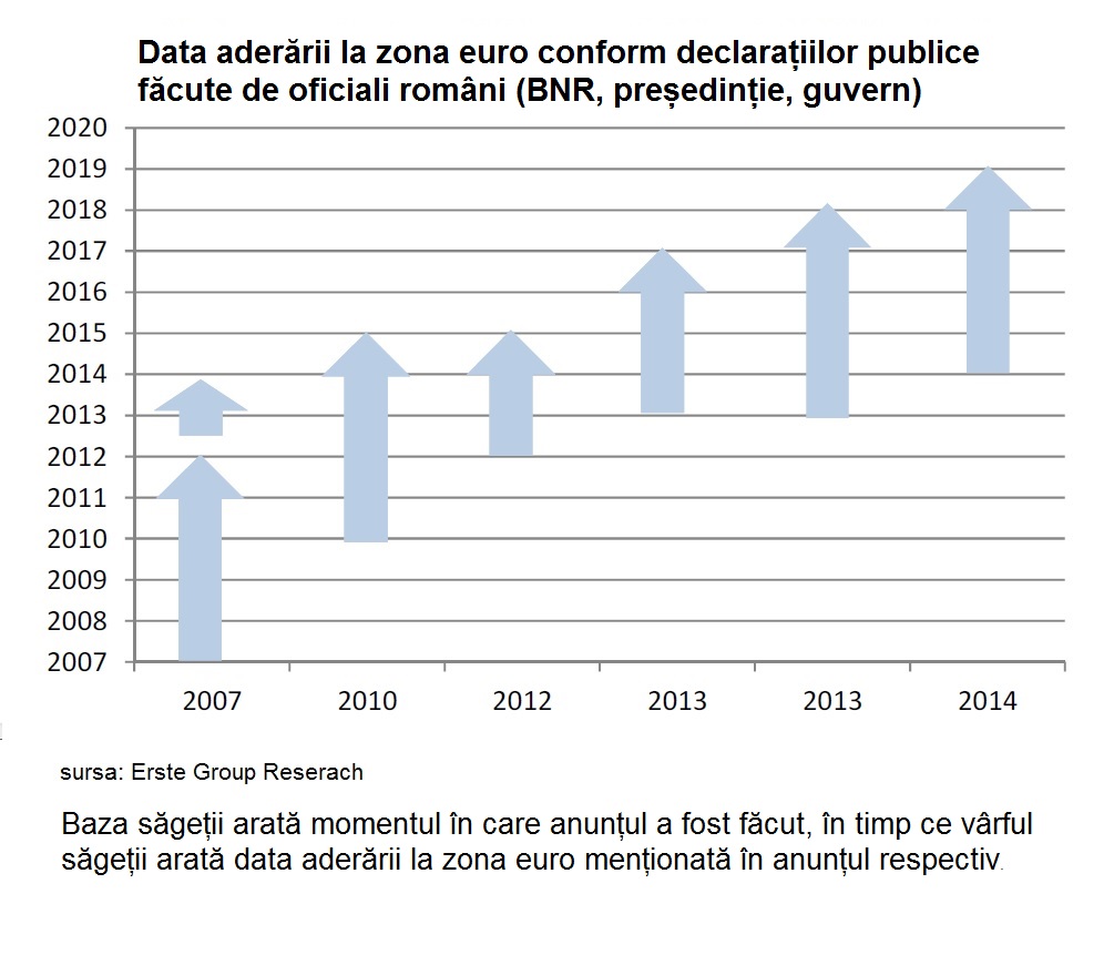 Din 2007 încoace, autorităţile româneşti au modificat de mai multe ori termenul de aderare la moneda Euro, ceea ce i-a făcut pe analiştii de la Erste Group Research să constate că „în ultimii șapte ani, oficialii români au transformat data aderării României la zona euro într-o țintă mișcătoare, așa cum arată și graficul de mai jos”, potrivit unui studiu primit de ECONOMICA.NET.