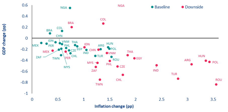 Figura 1: Evoluția ratelor inflației și a creșterii PIB-ului în 2026 în anumite piețe emergente, scenariul de referință comparativ cu scenariul pessimist