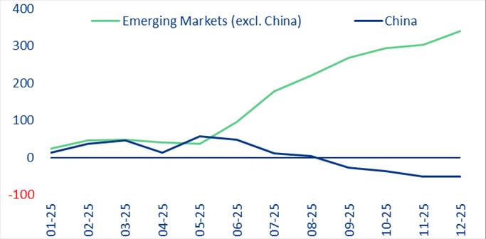 Noua escaladare a conflictului din Orientul Mijlociu ar putea anula câștigurile record înregistrate de piețele emergente. Anul 2025 a început cu ieșiri masive de capital din piețele emergente (cu excepția Chinei), ajungând la un minim cumulativ de -10,8 miliarde USD în perioada implementării tarifelor impuse de președintele Trump cu ocazia „Zilei Eliberării”. Totuși, acest moment a marcat un punct de cotitură, întrucât încrederea pieței și deprecierea dolarului au jucat în favoarea piețelor emergente, determinând revenirea fluxurilor de capital. Ca urmare, anul 2025 s-a încheiat cu fluxuri record de portofoliu (410 miliarde USD), aproape dublu față de anul precedent, mult peste media istorică și o inversare a tendinței față de ieșirile de capital înregistrate după pandemie. Fondurile de obligațiuni din piețele emergente au încheiat anul 2025 cu primele lor intrări nete anuale din 2021, totalizând +31,8 miliarde USD.