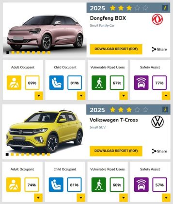 Dincolo de controversa născută de calificativul acordat modelelor Dongfeng BOX și Volkswagen T-Cross, chiar dacă primul are, în varianta standard, mai multe echipamente de siguranță punctate de Euro NCAP, cel mai recent test Euro NCAP a arătat că noile DS N8 și Mitsubishi Grandis sunt demne de patru stele, în timp ce toate celelalte, produse în toate colțurile lumii – Audi Q3, Audi BMW X3, Cadillac Optiq, Cherry Tiggo 7, Cherry Tiggo 8, Cupra Born, EBRO s700, EBRO s800, Hongqi EHS5, IM 5, Mazda 6e, MG S6 EV, Skoda Octavia, Volkswagen Golf și Volkswagen ID.4 (acestea diin urmă asamblate pe aceeași platformă cu penalizatul T-Cross), au obținut câte cinci stele.