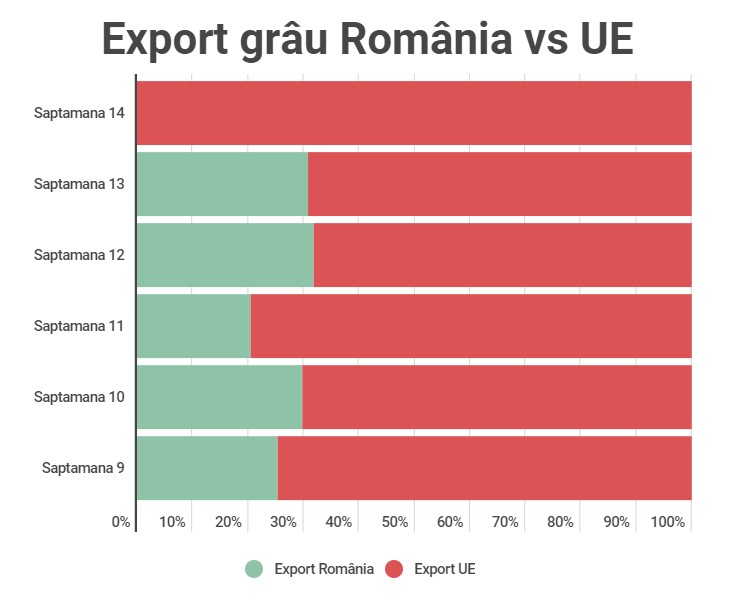 După cinci săptămâni succesive în care a dominat clasamentul exportatorilor europeni de grâu, România lasă locul Poloniei într-o perioadă în care valorile totale sunt, în sfârșit, pe deplin conforme cu realitatea. Chiar și cu exporturi de 1 tonă în ultima săptămână, țara noastră rămâne liderul detașat al pieței cu un total de 2,9 milioane de tone comercializate pe piețe terțe, reprezentând 36% din total.