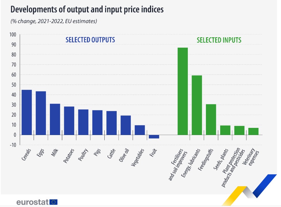 Prețul mediu al bunurilor agricole produse în UE a crescut cu 24% între 2021 și 2022. Cele mai puternice creșteri de preț au fost înregistrate la cereale (+45 %), ouă (+43 %) și lapte (+31 %).