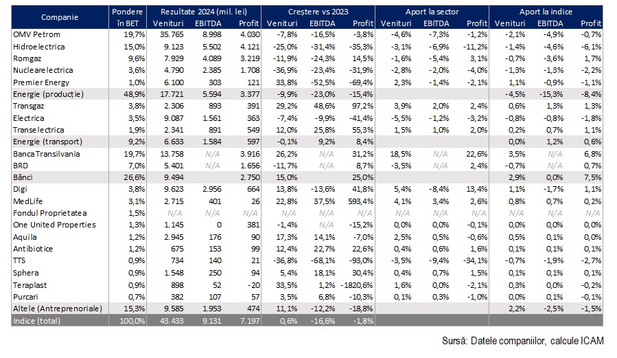 În 2024, companiile din producția de energie, care reprezintă aproape jumătate din indicele BET, au înregistrat performanțe semnificativ sub așteptări și au fost principalul factor de scădere a performanței generale a indicelui. Acest grup include OMV Petrom, Hidroelectrica, Romgaz, Nuclearelectrica și Premier Energy. Sectorul a raportat o scădere anuală de 10% a veniturilor, însoțită de o reducere de 23% a EBITDA și de o diminuare de 15% a venitului net. Toți cei cinci producători de energie au înregistrat scăderi la nivelul principalilor indicatori financiari, cu excepția Premier Energy, care a avut un impact pozitiv de 1,1% asupra veniturilor totale ale indicelui, și a Romgaz, care a contribuit cu 1,7% la profitul indicelui datorită eliminării contribuției de solidaritate. Totuși, această normalizare nu compensează pe deplin preocupările existente, mai ales în contextul incertitudinilor fiscale persistente. Guvernul României continuă să analizeze posibile ajustări fiscale pentru a acoperi deficitul bugetar, iar companiile din sectorul energetic rămân o țintă probabilă pentru taxe impuse anumitor industrii.