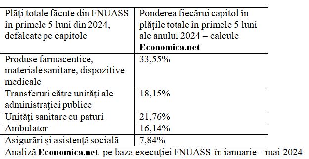 Ponderea plăţilor către spitale (unităţi sanitare cu paturi în execuţia FNUASS) a scăzut cu 0,8 puncte procentuale în perioada comparată de Economica.net.