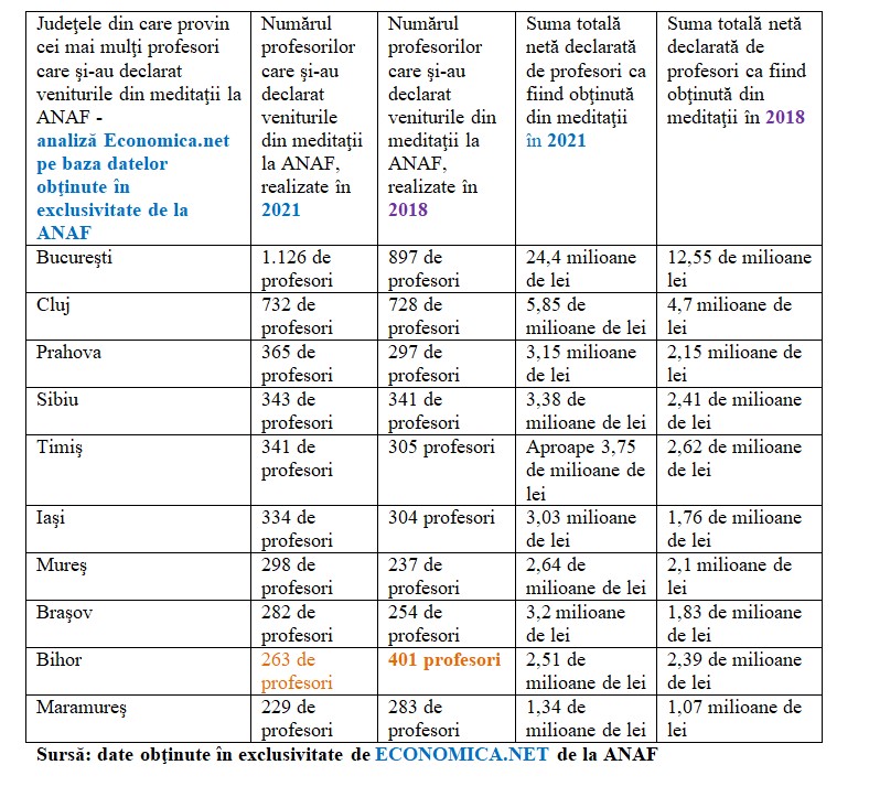Cei mai mulţi profesori care şi-au declarat veniturile din meditaţii la ANAF, realizate în anul 2021, sunt din Bucureşti şi Cluj, arată datele obţinute de Economica.net de la ANAF.