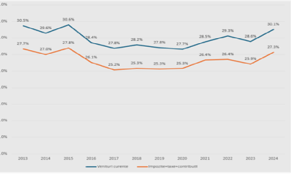 Ponderea veniturilor din impozite, taxe și contribuții în PIB a ajuns la sfârșitul anului 2024 aproape de nivelul din 2015, cel mai ridicat din ultimul deceniu. Statul român a colectat cu 1,4 puncte procentuale mai mult din PIB, dar acest efort fiscal suplimentar nu a reușit să echilibreze explozia cheltuielilor.