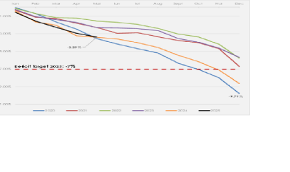 La finalul lunii mai 2025, deficitul bugetului public cumulat aproape egalează nivelul din anul precedent, iar comparația devine și mai îngrijorătoare când ne gândim că în 2024 s-a atins un procent din PIB similar cu cel din 2020 – anul pandemiei. Doar că de această dată nu avem o criză sanitară globală care să justifice aceste cifre. Dar ce avem?