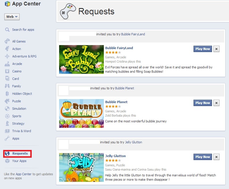 Intraţi pe pagina de Facebook. Click pe App Center din partea dreapta a ecranului. Apoi, faceţi click pe butonul Requests/Cereri, care vă arată toate cererile de jocuri venite din partea prietenilor.
