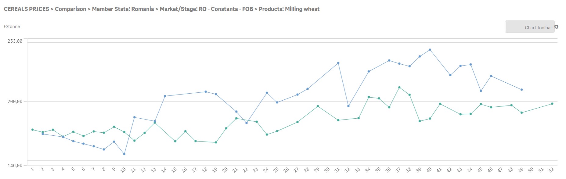 Potrivit datelor Comisiei Europene, prețul mediu FOB al grâului de panificație în portul Constanța a ajuns în săptămâna 49 ( 10 iunie) la 210 euro tona, față de 190,6 euro tona în perioada similar a anului trecut. Raportat la săptămânile anterioare, câștigul fermierilor și al traderilor este cu 5% mai mic, în săptămâna 46, ultima pentru care există date disponibile, prețul fiind de 221,6 euro. Anul acesta, cel mai mare preț mediu pe tona de grâu vândut în portul Constanța a fost de 243,7 euro, în timp ce anul anterior nu s-a depășit pragul de 211,9 euro.