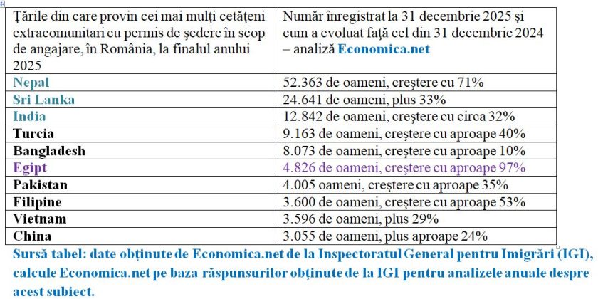 Numărul străinilor care aveau permis de şedere în scop de muncă la finalul anului 2025 e cu aproape 48% mai mare decât cel înregistrat la finalul anului 2024, arată analiza Economica.net pe baza datelor pe care le-am obţinut de la Inspectoratul General pentru Imigrări (IGI).