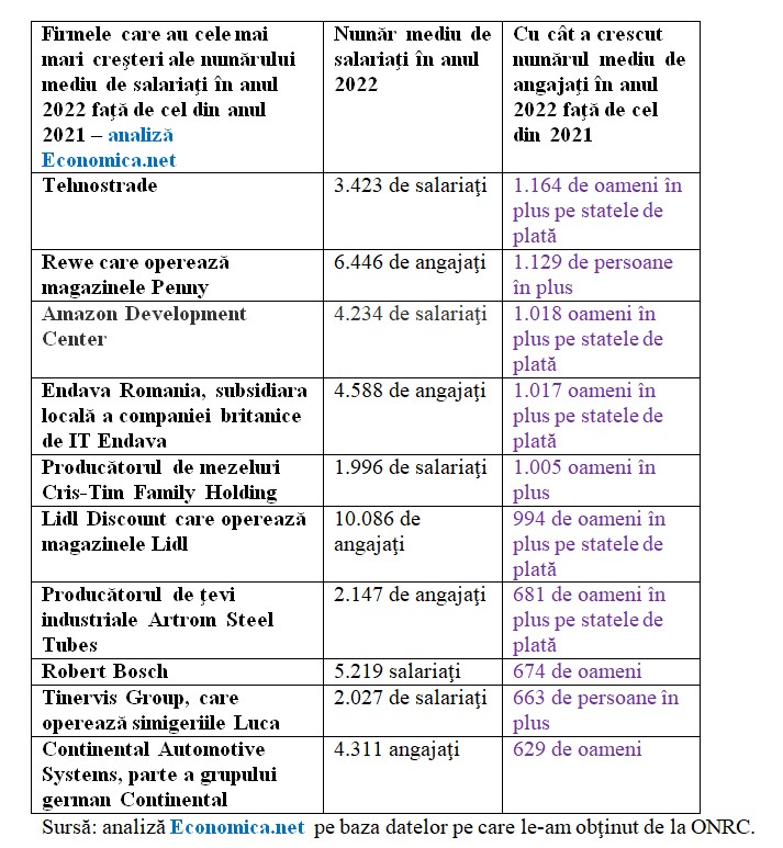 Cinci firme private şi-au sporit numărul mediu de angajaţi cu peste 1.000 de oameni în anul 2022 faţă de nivelul indicatorului din anul 2021, arată o analiză Economica.net pe baza datelor pe care le-am obţinut de la ONRC. Acestea sunt: Tehnostrade, Rewe, Amazon Development Center, Endava Romania şi Cris-Tim Family Holding, reiese din analiza Economica.net.