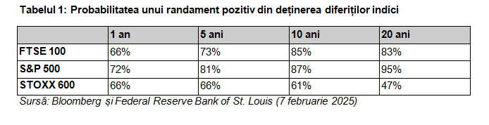 Pe baza datelor istorice, probabilitatea unui randament pozitiv în cazul deținerii unui portofoliu bazat pe indicele american S&P 500 timp de un singur an este de 72% (tabelul 1). Această cifră crește la 87% dacă este deținut timp de 10 ani și la 95% dacă este deținut timp de 20 de ani. Datele privind indicele britanic FTSE 100 prezintă aceeași situație, probabilitatea unui randament pozitiv crescând de la 66% pentru un an la 83% pentru o relație de 20 de ani.