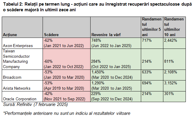 Investitorii care au trecut peste perioadele dificile cu acțiunile unor companii precum Broadcom, Arista Networks și TSMC, rămânând pe poziții în timpul scăderilor de 50-60%, au fost recompensați în cele din urmă cu câștiguri masive (tabelul 2). Broadcom, de exemplu, a înregistrat o scădere de 53% a prețului acțiunilor sale în perioada ianuarie – martie 2020, dar a recuperat apoi cu o creștere de 1450% până la atingerea maximului istoric în ianuarie 2025.