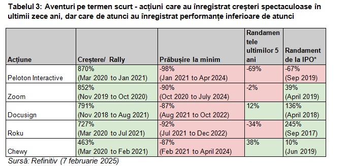 Pe de altă parte, investitorii care au fost cuceriți de creșterile spectaculoase înregistrate de titluri precum Zoom, Peloton și Docusign au avut mai puțin noroc în dragoste, deoarece aceste acțiuni s-au prăbușit la scurt timp după aceea și continuă să înregistreze performanțe inferioare pieței (tabelul 3). Peloton a înregistrat cea mai mare creștere, de 870%, dar și cea mai mare prăbușire, de 98%, iar în prezent prețul acțiunilor sale este departe de cel de la IPO.