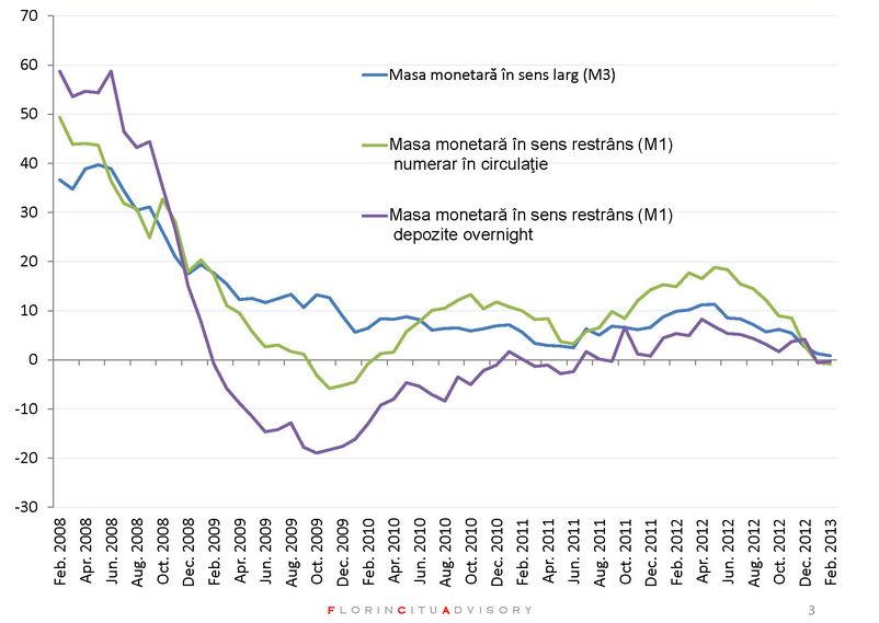 El avertizează că suntem aprope de punctul critic pentru creditele neperformante, iar sistemul financiar bancar intră într-o perioadă de restructurare care va dura caţiva ani. Ambele ar înseamna o creditare redusă a economiei şi, implicit, o creştere economică mai mică. Graficele arata nu numai ca sistemul financiar nu creditează economia (M3 rata de crestere anuala), dar şi că cererea pentru numerar din economie a scăzut. Altfel spus, indicatorii monetari arată o economie care se restrânge.